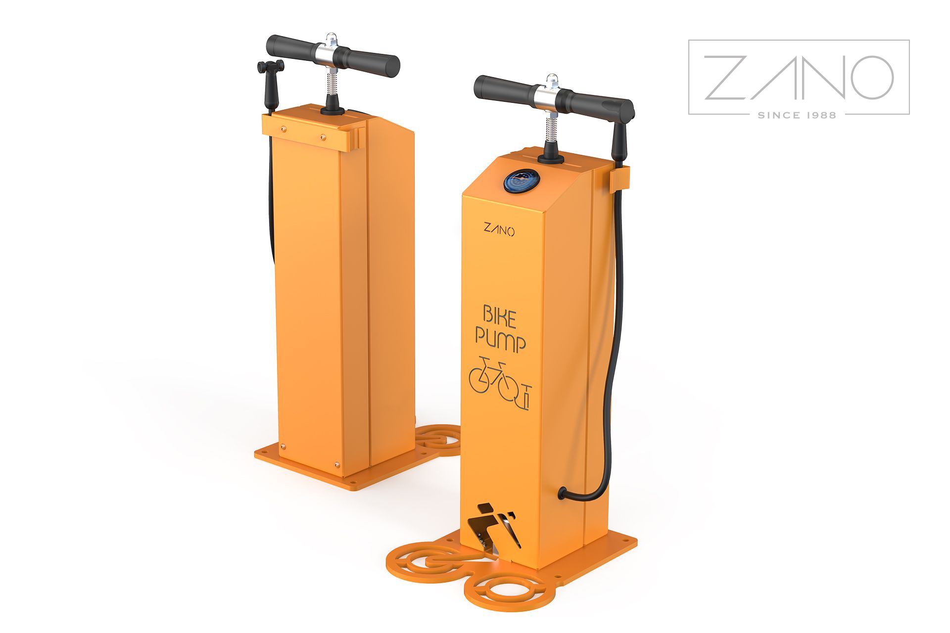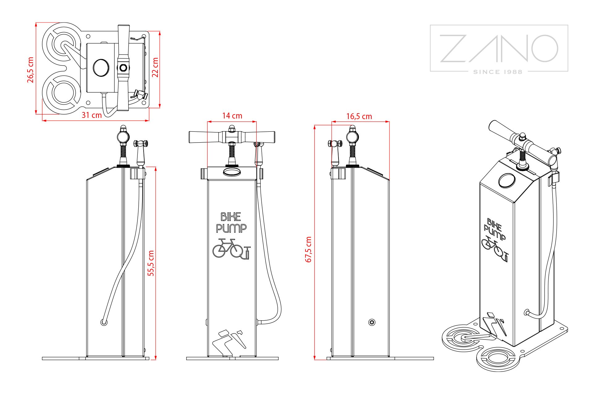 Podna pumpa Kangu dizajnirana za neovisno napuhavanje kotača, opremljena manometrom. Konstrukcija je savijena i spojena vijcima od čeličnih limova debljine 2 mm i 8 mm, izrađenih od ugljičnog čelika S235Jr, pocinčanih i praškasto obojenih premaRAL palete ili u potpunosti izrađeno od poliranog nehrđajućeg čelika 1.4301. Moguće je prilagođavanje. Načini postavljanja logotipa: