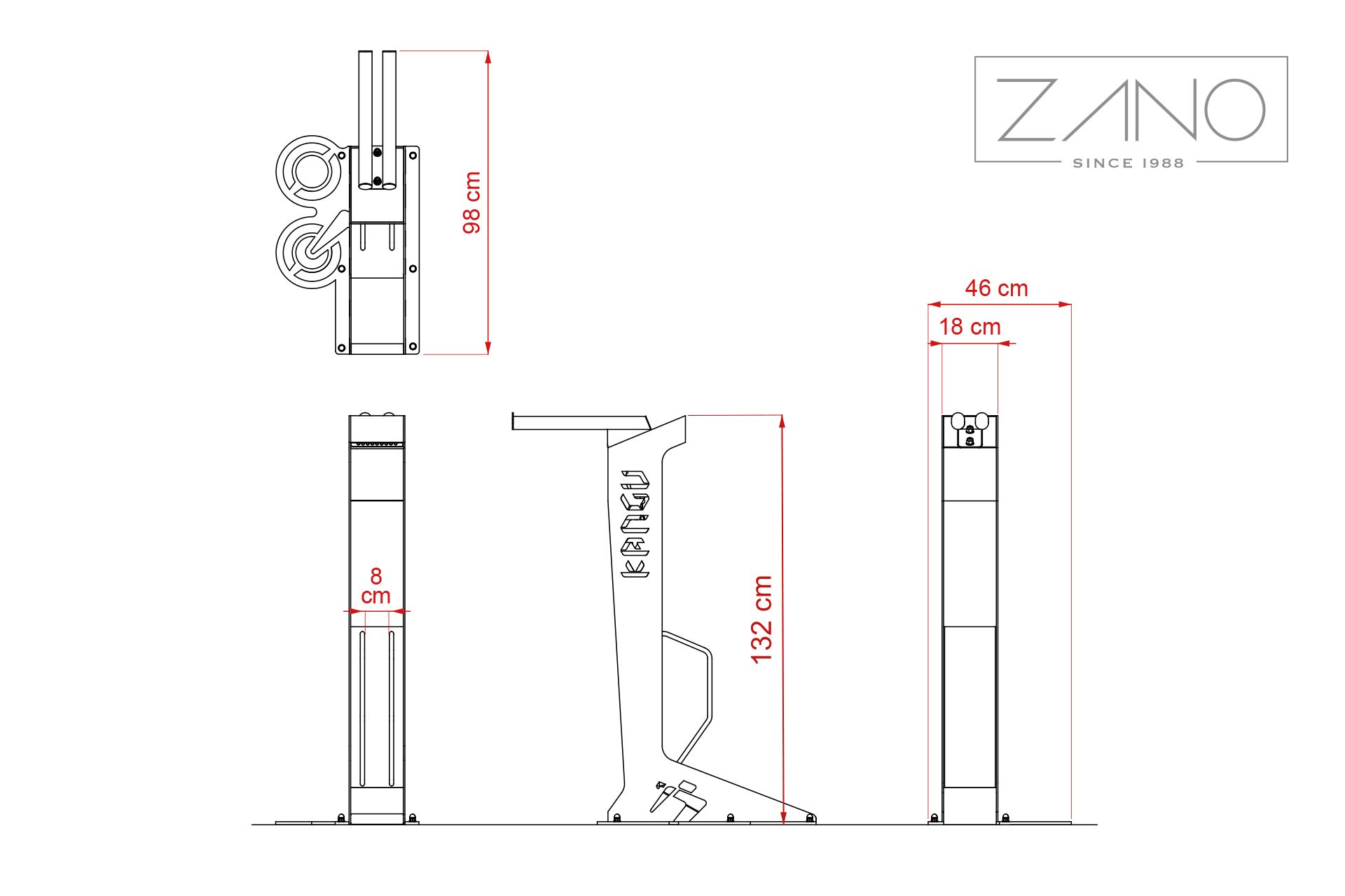 Stalak nadopunjuje KANGU liniju biciklističkih postaja. Ima prepoznatljiv motiv biciklista, uklesan u podnožje stalka i svake postaje.