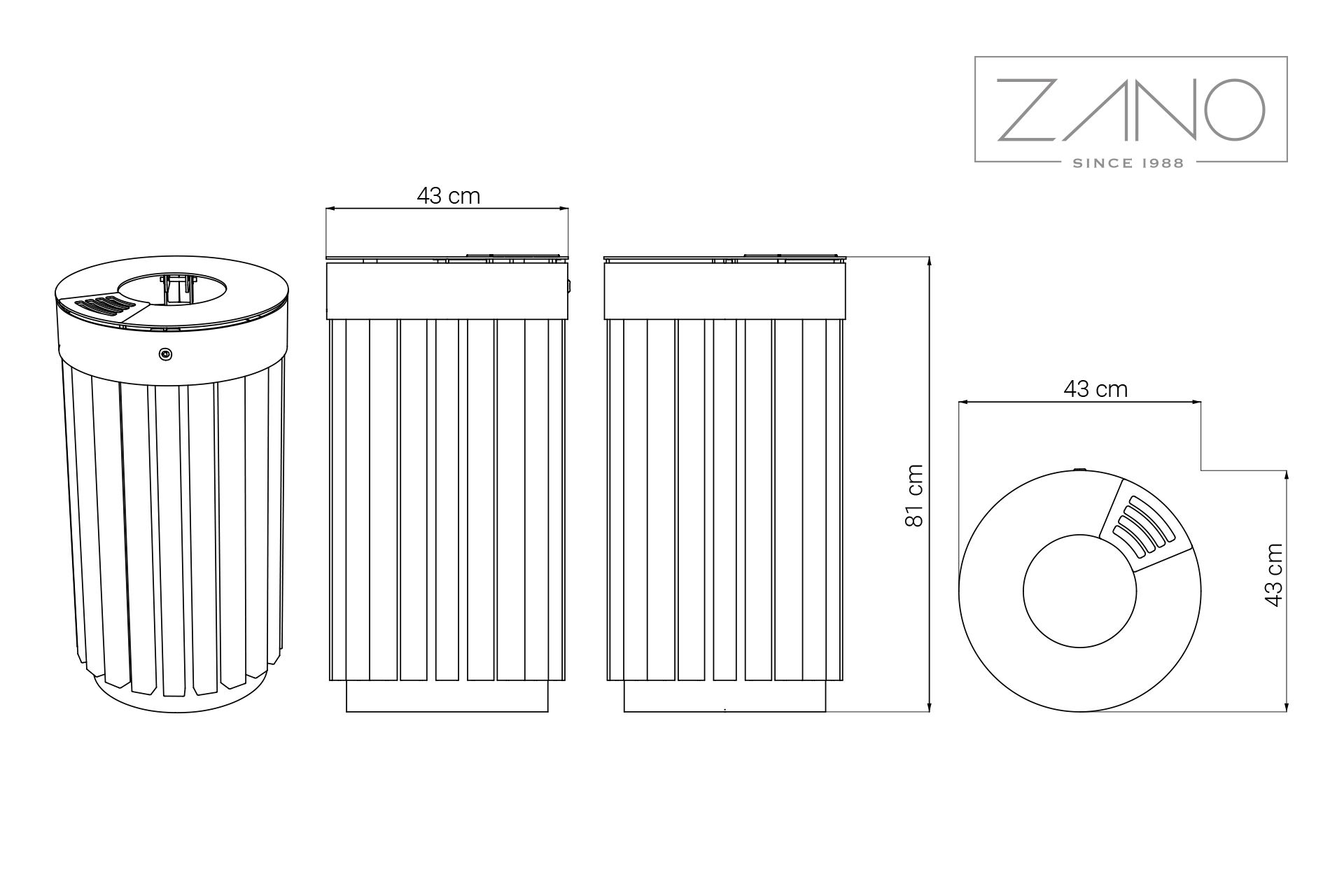 Kanta za gradski otpad Tubus. Ovaj model uključuje pepeljaru. Unutra se nalazi uklonjivi pocinčani limeni uložak. Kanta je izrađena od čelika i ukrasnih drvenih dasaka. Dostupne opcije uključuju nehrđajući čelik i ugljični čelik, pocinčane i obojene u bilo koju RAL boju koju odredi kupac. Dostupne opcije drva uključuju europsko meko drvo i egzotično tvrdo drvo.