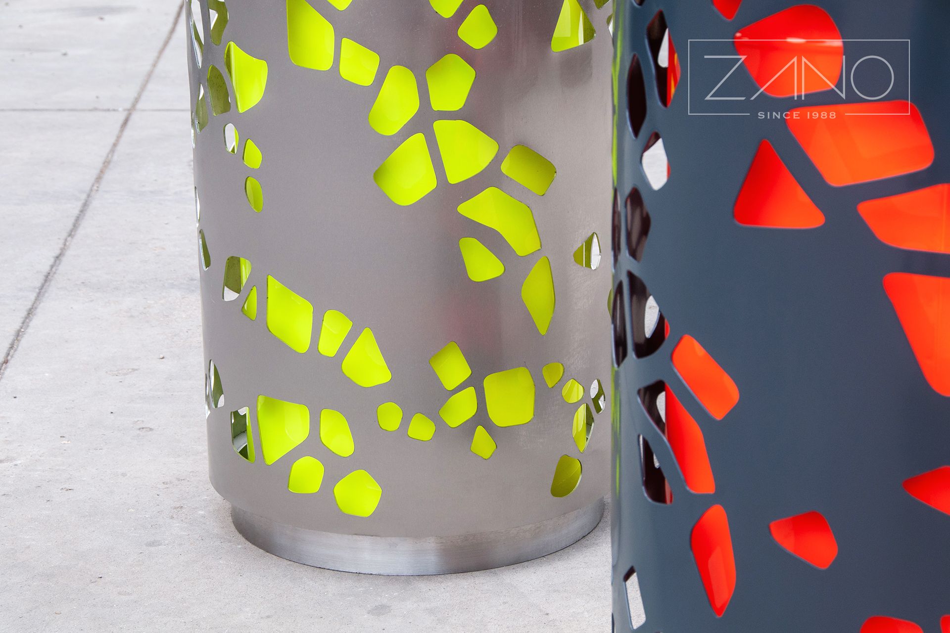 Kante za gradski otpad Tubus dostupne su u tri osnovne varijante: kanta s čeličnim šipkama, kanta s drvenim daskama i kanta s limom oko nje s izrezanim organskim motivima.
