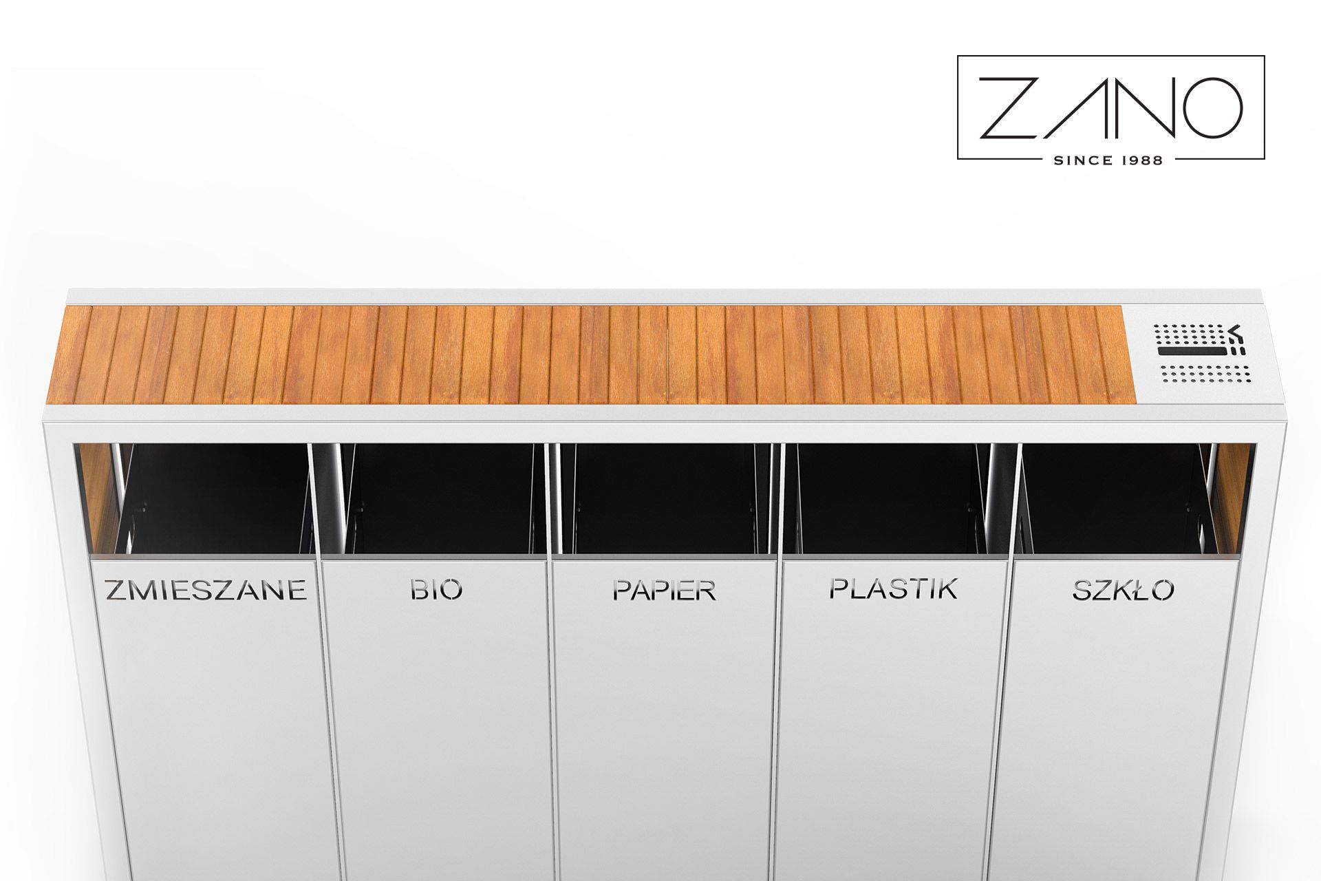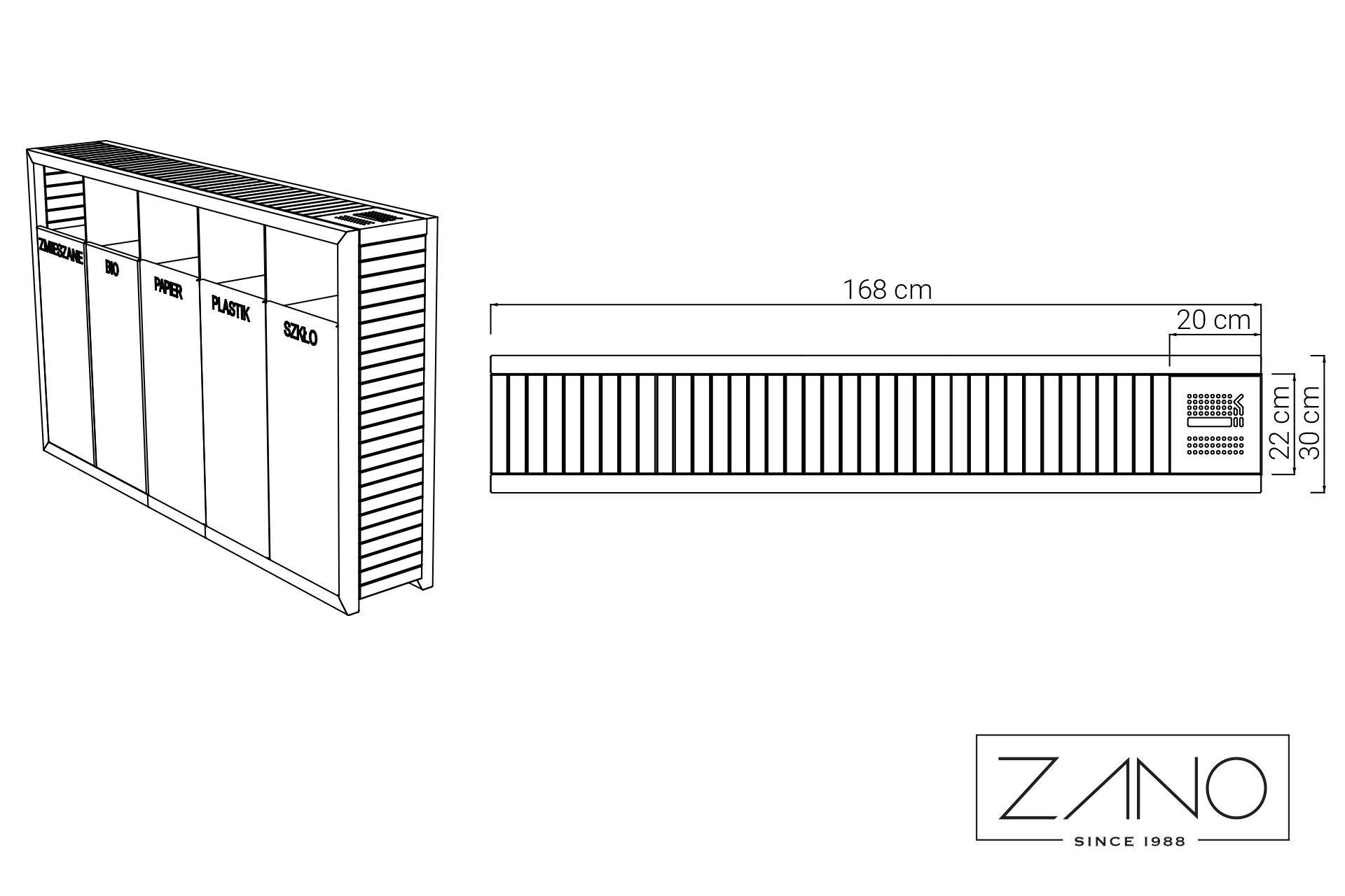 Kanta za otpad s pet komora Pavo 15.563.2 je zavarene konstrukcije s drvenim daskama. Dostupne opcije čelika uključuju pocinčani i praškasto premazani ugljični čelik u RAL paleti ili polirani nehrđajući čelik u cijelosti. Kućište kante izrađeno je od europskih mekih drvenih ploča, impregniranih i lakiranih dva puta, ili od egzotičnog tvrdog drva, impregniranog i nauljenog dva puta. Kanta je opremljena spremnikom od pocinčanog čelika i pepeljarom.