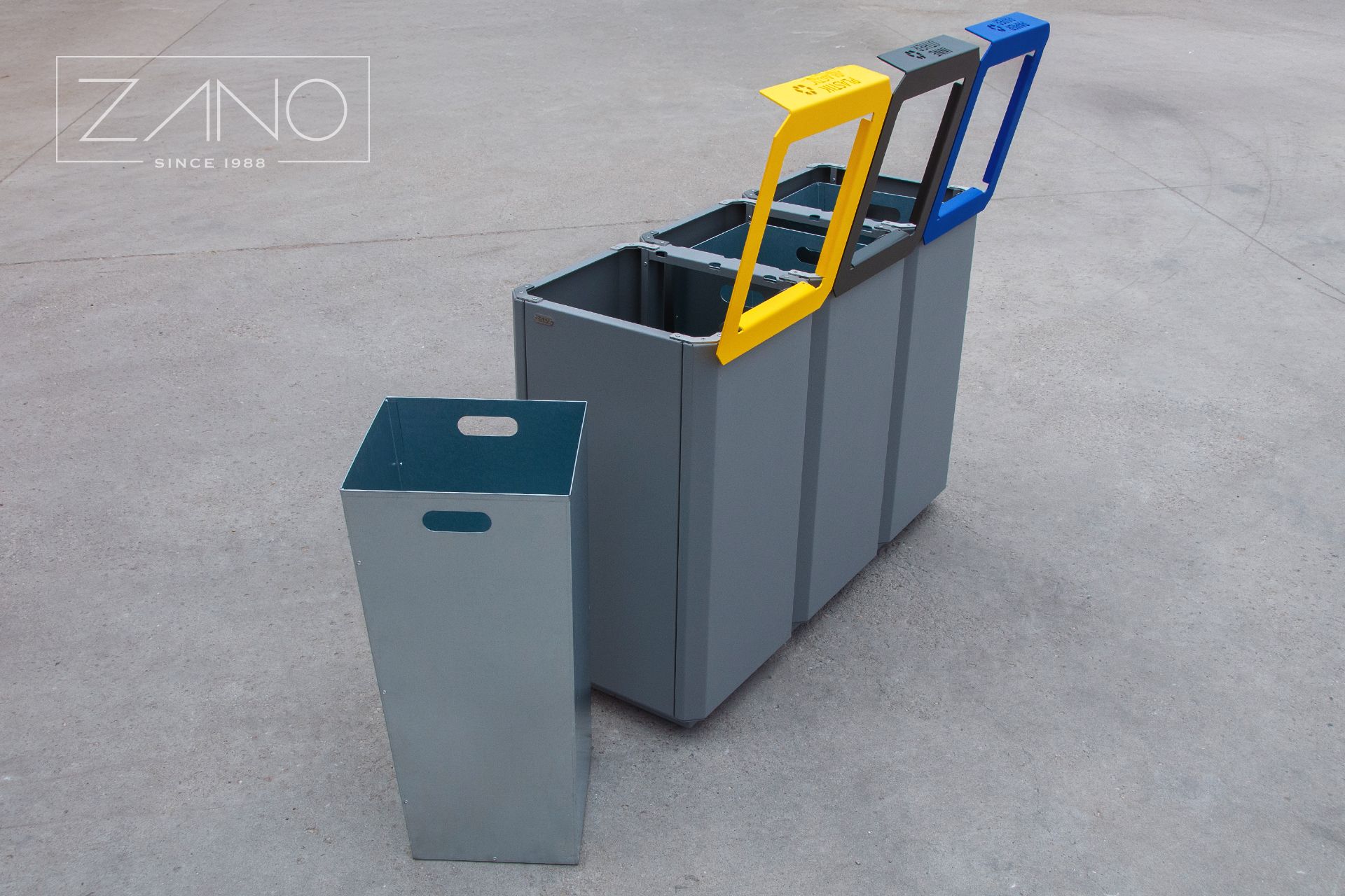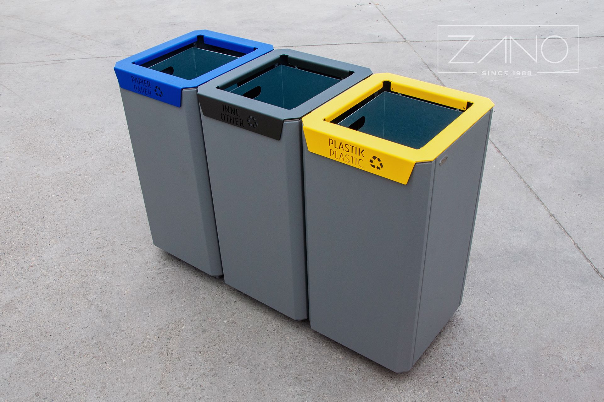 Kanta za reciklažu 15.048 je zakrivljena konstrukcija izrađena od ugljičnog ili nehrđajućeg čelika. Otvara se s vrha i opremljena je unutarnjim umetcima. Prilagodba je dostupna na zahtjev - opcija crnog čelika je praškasto obojena u bilo kojoj RAL boji, a natpisi se mogu izrezati, zalijepiti ili, u slučaju nehrđajućeg čelika, ugravirati. Ugradnja kante: pričvršćivanje vijcima. Košara se može pohvaliti jednostavnim, modernim dizajnom - sa ili bez krova, dostupna u verzijama s jednim i više odjeljaka.