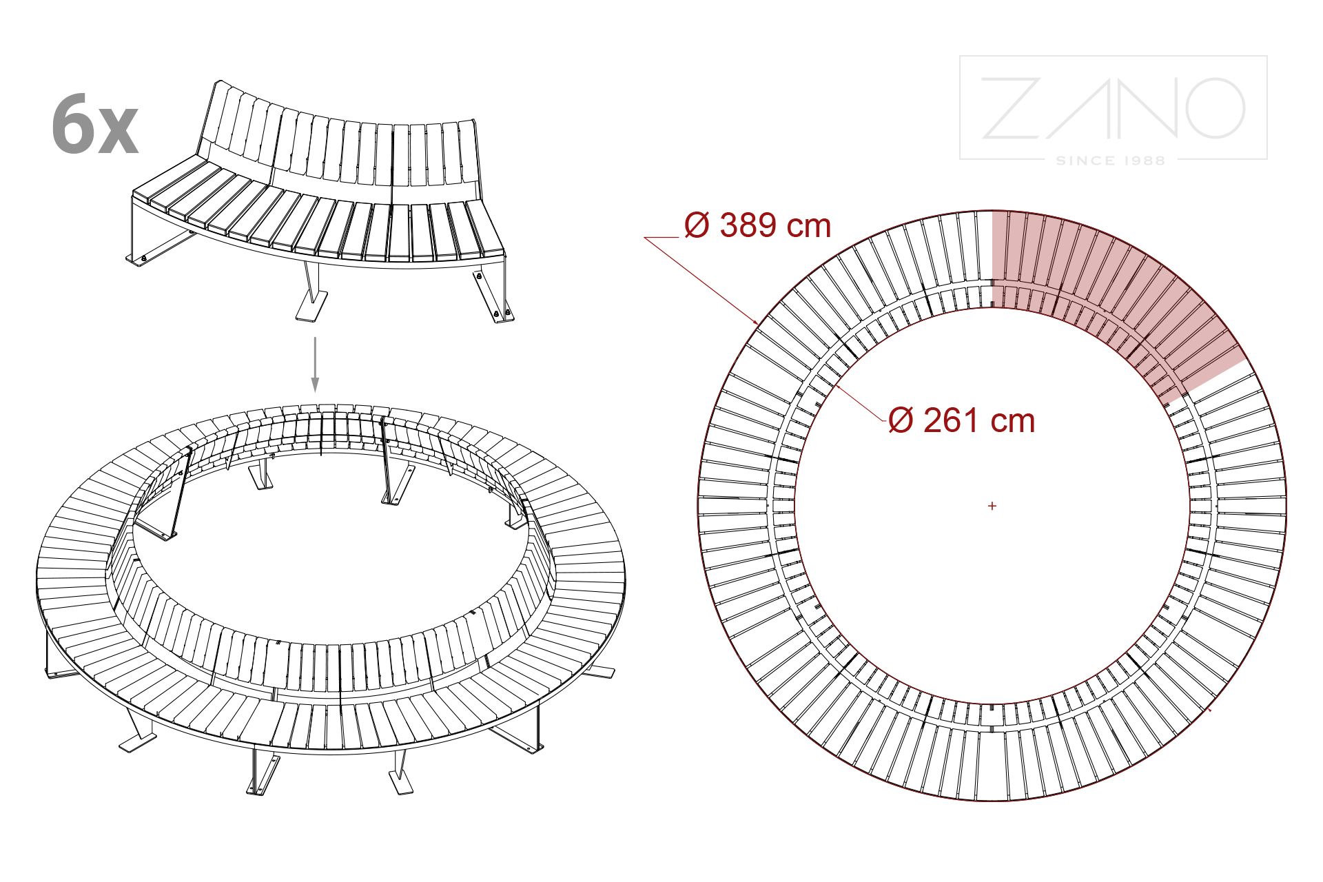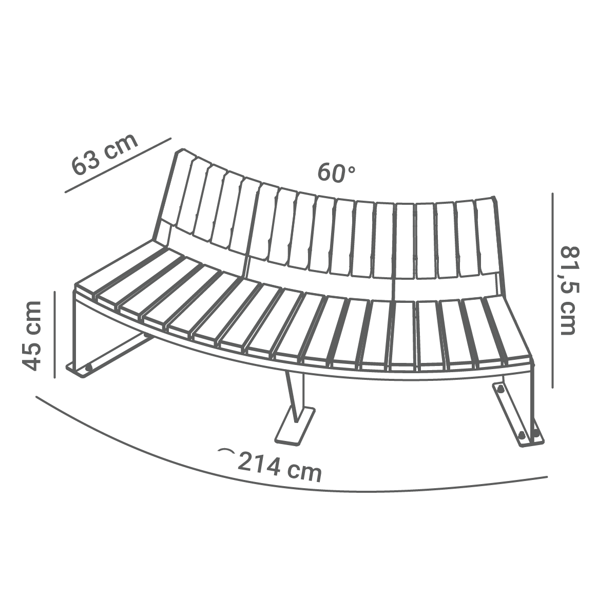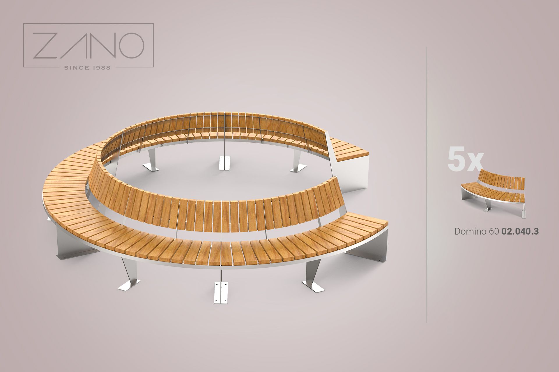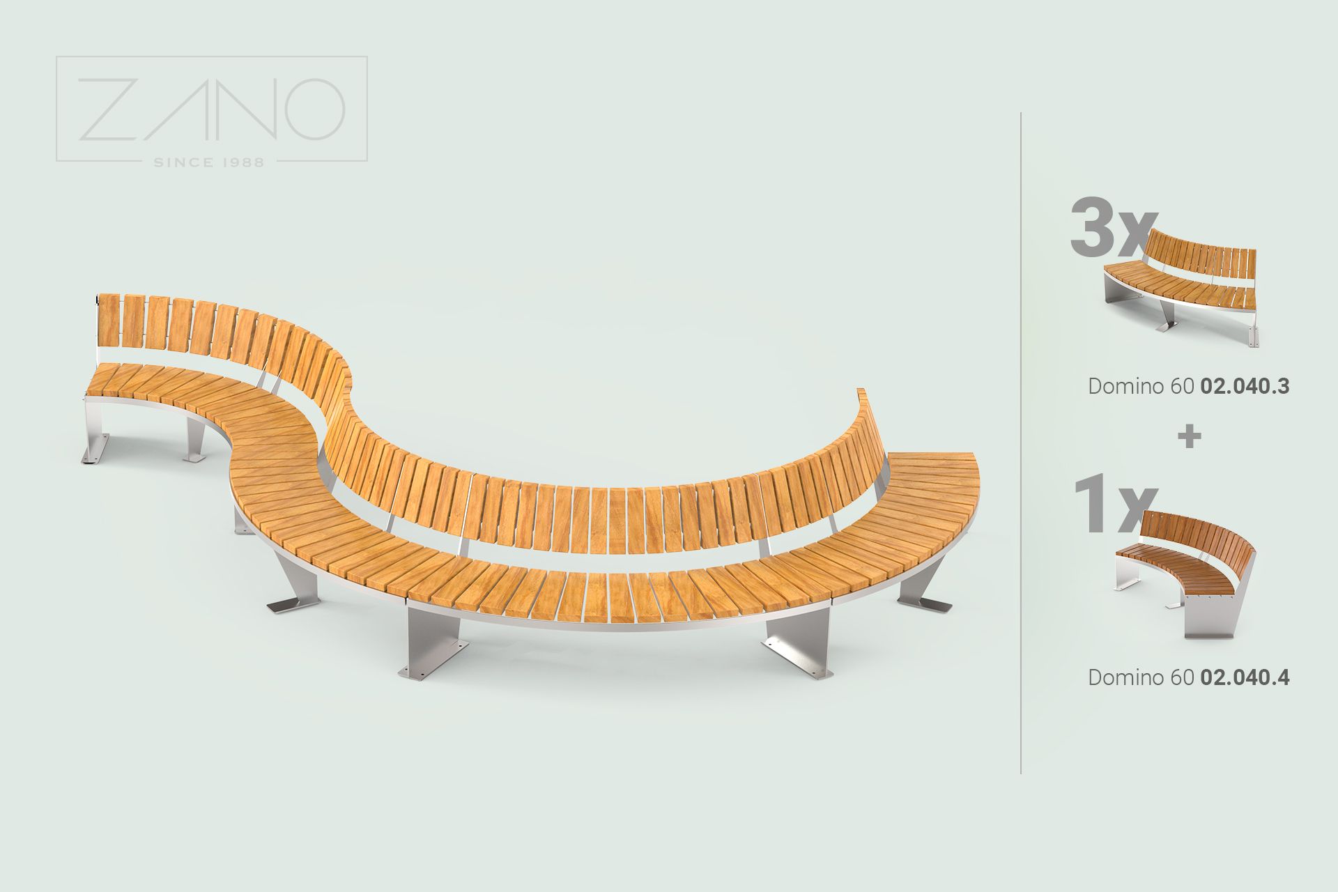 Domino Gradska klupa od 60º s naslonom je modularni element dizajniran za stvaranje dugih, vijugavih prostornih kompozicija. Pojedinačne klupe mogu se spojiti pomoću montažnih rupa u nogama. Prilikom spajanja dviju klupa, jednostavno upotrijebite jednu zajedničku nogu na spoju. Konstrukcija klupe izrađena je od nehrđajućeg čelika debljine 4-8 mm ili opcionalno od ugljičnog čelika iste debljine, koji je pocinčan i obojen u odabranoj RAL boji. Sjedalo i naslon izrađeni su od drveta. Postoje tri opcije koje možete izabrati: - meko drvo europskog podrijetla (lakirano), - tvrdo drvo europskog podrijetla (zaštićeno uljem), - tvrdo drvo egzotičnog podrijetla (zaštićeno uljem). Klupa je pričvršćena za tlo ekspanzijskim vijcima, što osigurava njezinu stabilnost i trajnost.