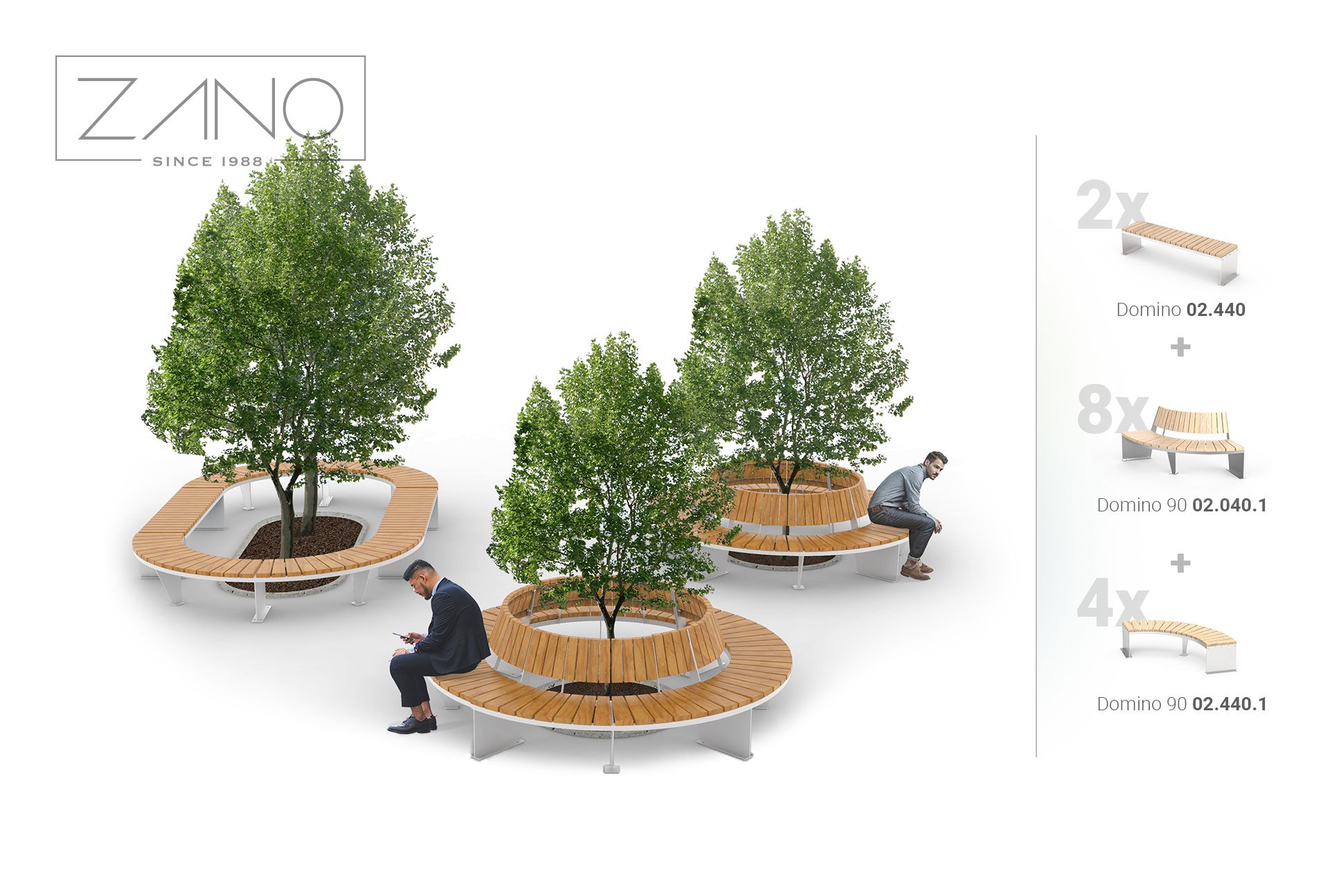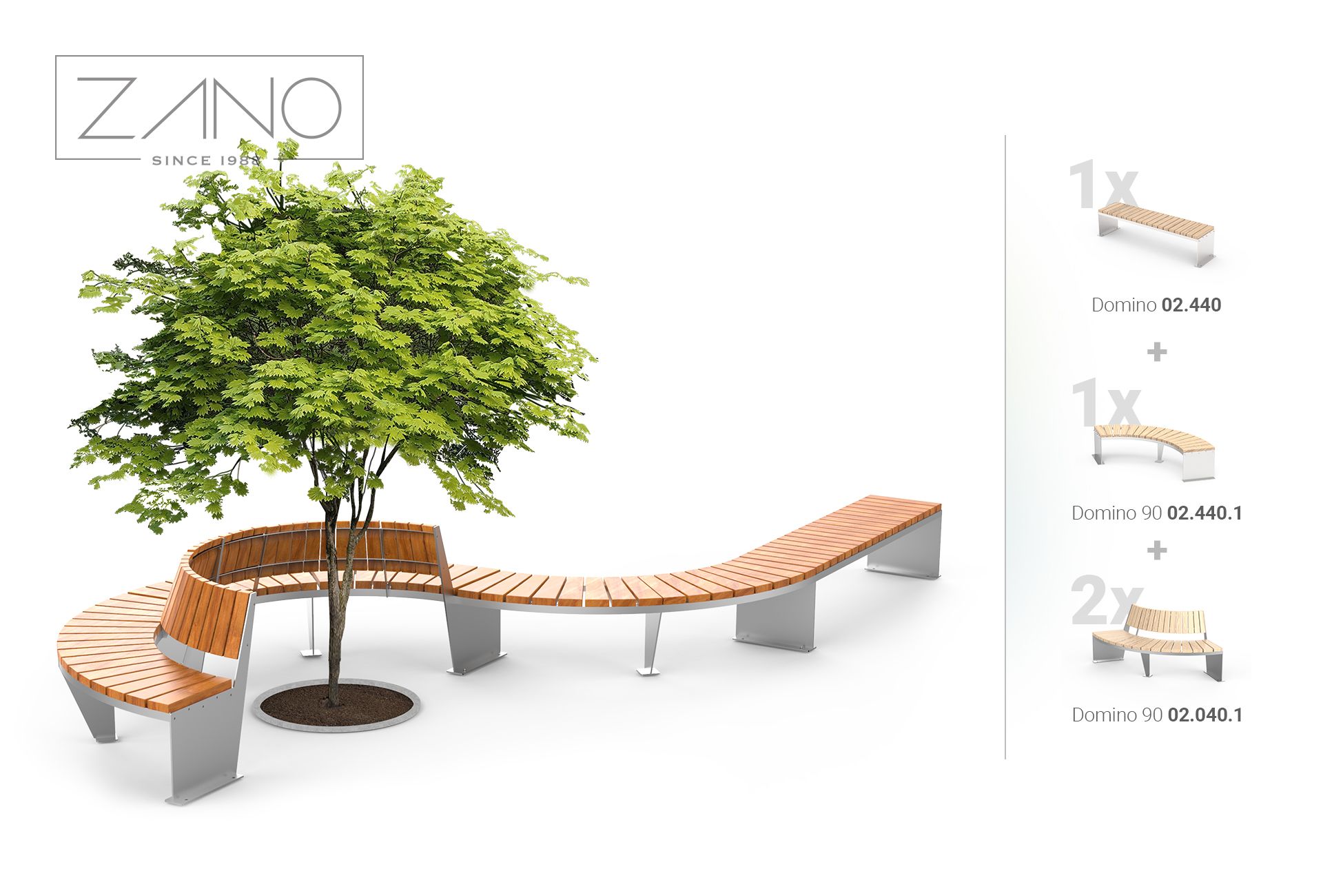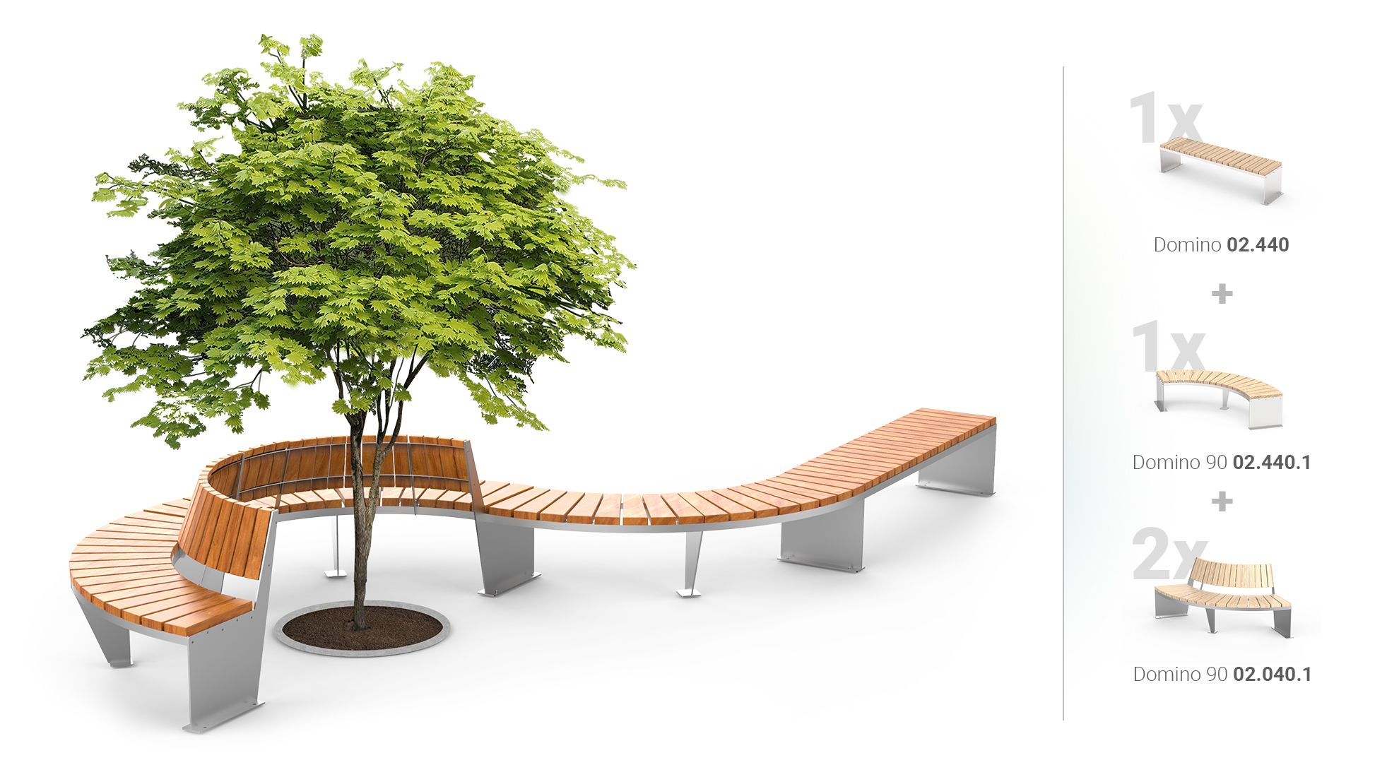 Klasična, jednostavna Domino klupa dizajnirana je kako bi proširila ili nadopunila kompoziciju ostalih polukružnih klupa (60° i 90°) u ovoj seriji. Estetika, vrhunski materijali i bezvremenski dizajn obilježja su klupe Domino 02.440. Nadalje, mogućnost kombiniranja klupa ovog dizajna u komponente bilo kojeg oblika jedinstveno je rješenje za svaki moderni javni prostor.
