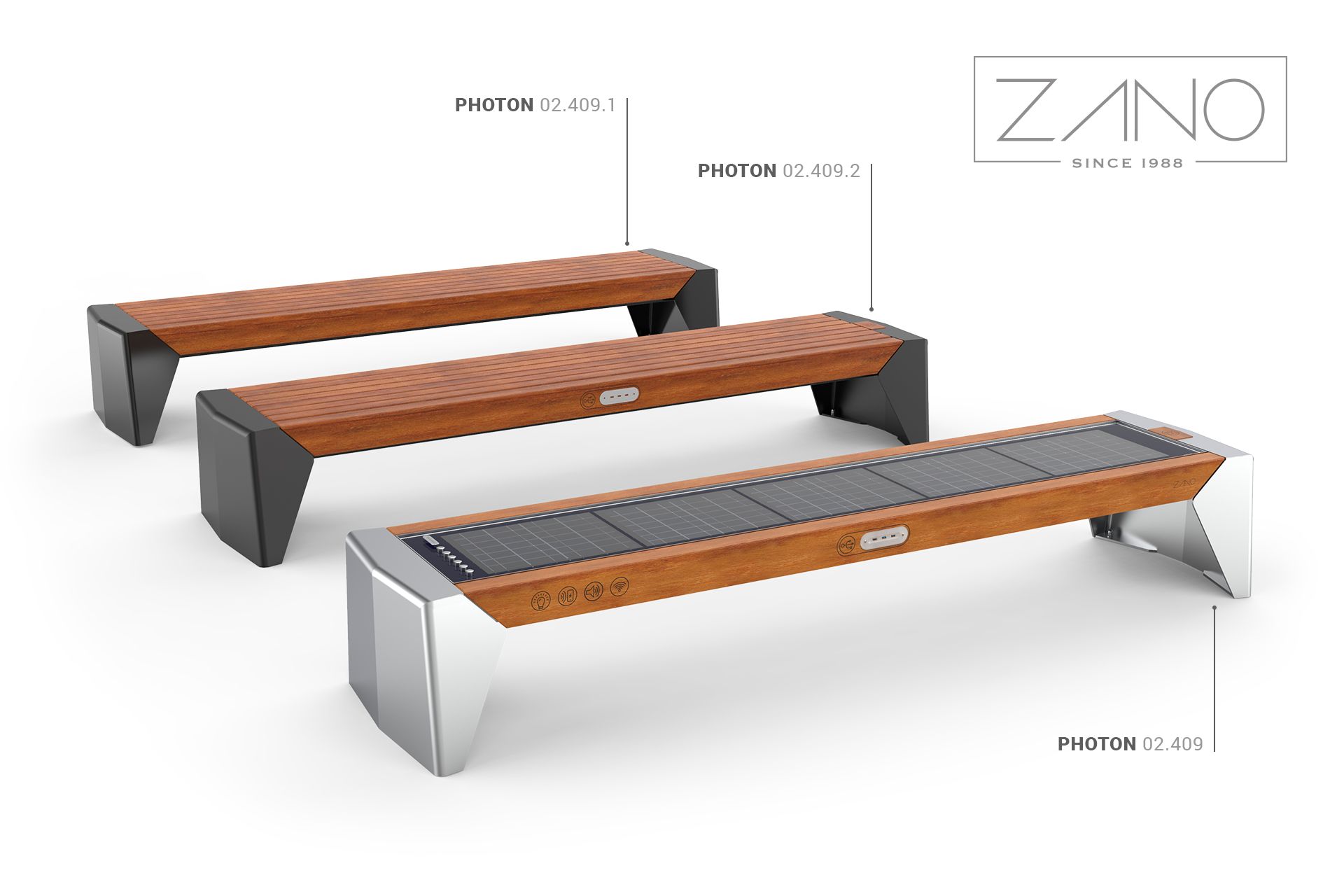 Gradska klupa Photon 02.409.1 je varijanta solarne klupe bez fotonaponskih panela i multimedijskih modula. Konstrukcija je izrađena od pocinčanog i praškasto obojenog ugljičnog čelika ili opcionalno od nehrđajućeg čelika. Drveni elementi izrađeni su od lakiranog europskog mekog drva ili opcionalno nauljenog egzotičnog drva. Klupa je savršena za unutarnje prostore poput trgovačkih centara, umjetničkih galerija, željezničkih kolodvora i zračnih luka. Također dobro funkcionira na otvorenom: u vrtovima, na ulicama, šetnicama, parkovima i drugim javnim prostorima.