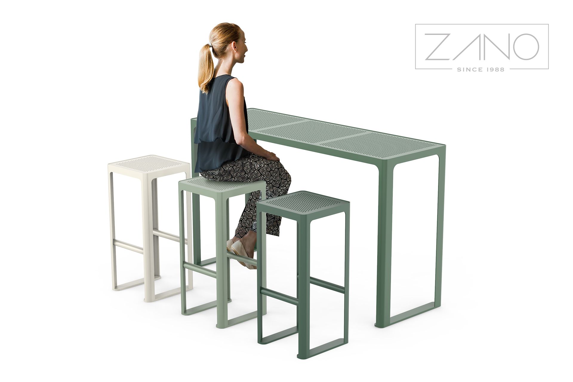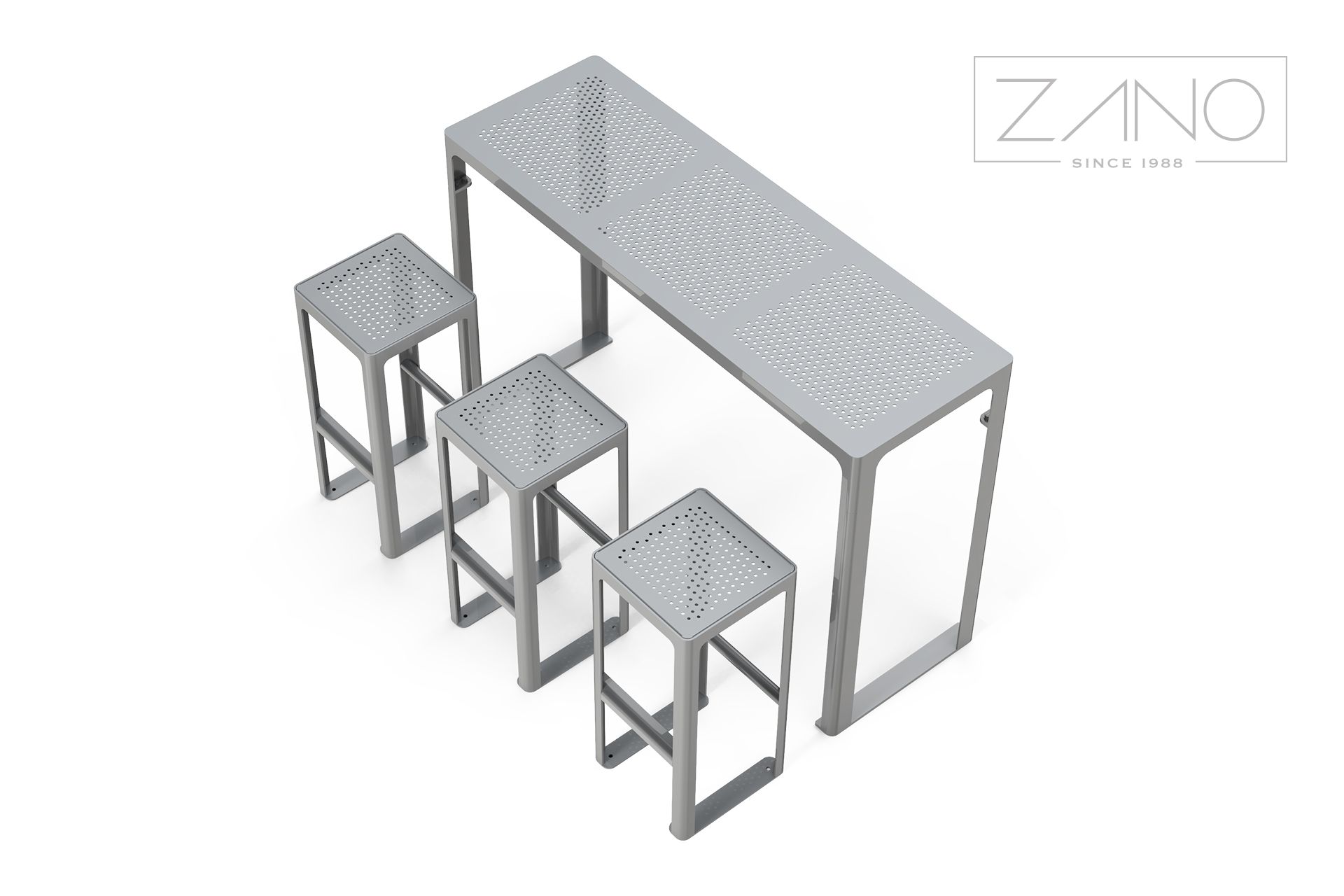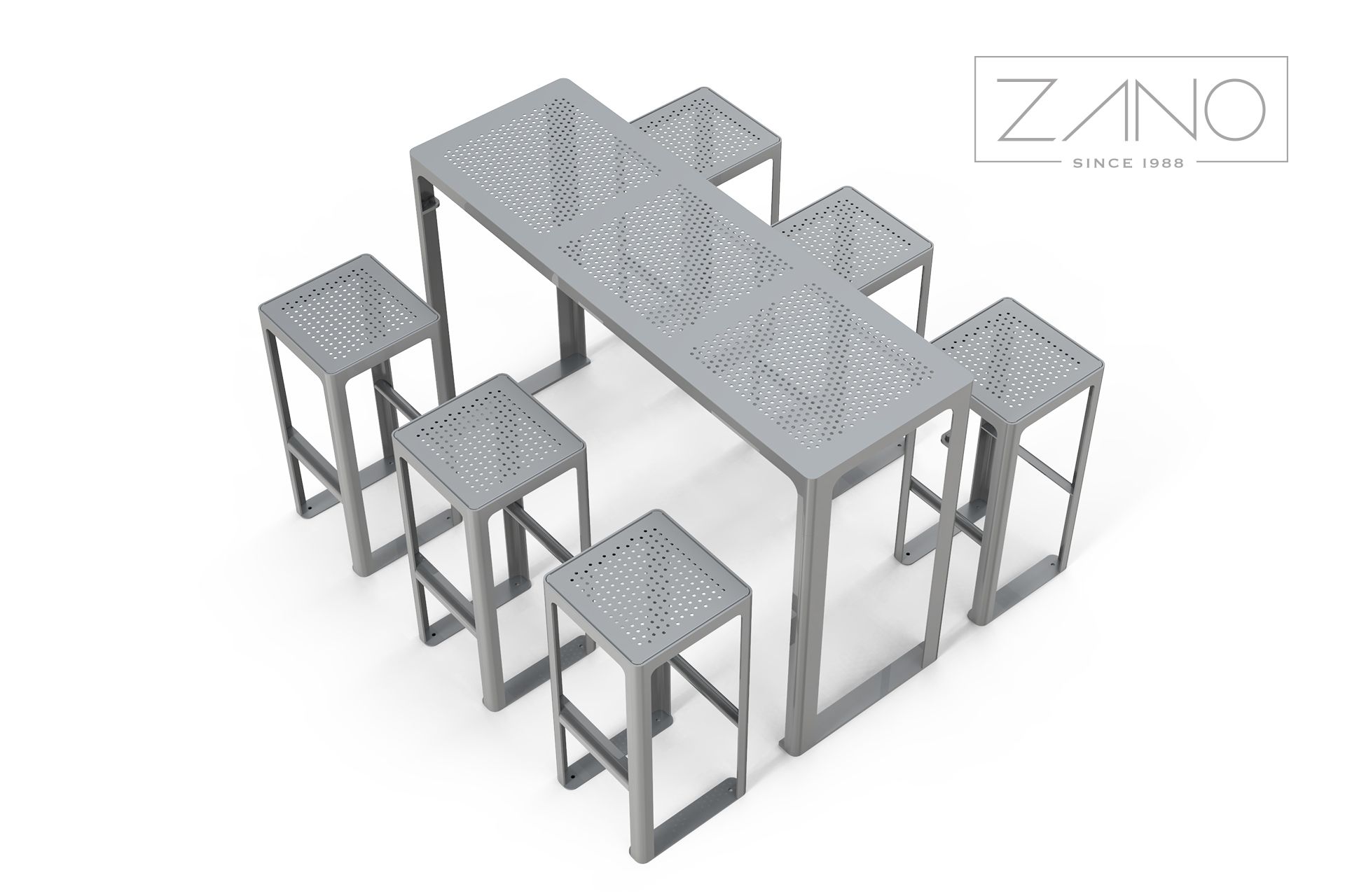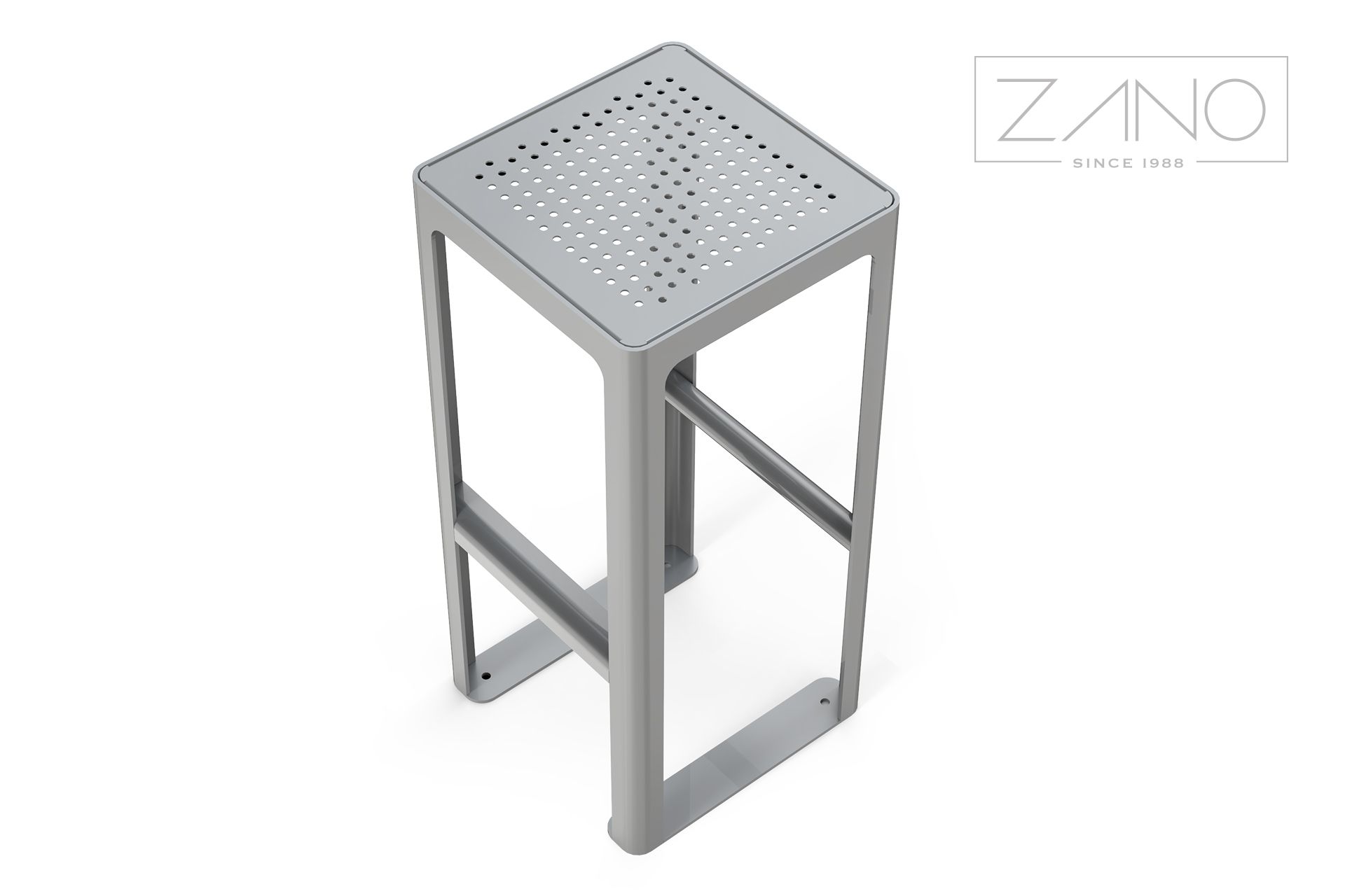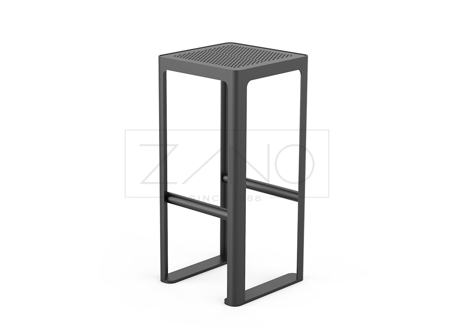 Barska stolica od nehrđajućeg čelika ilipocinčani, praškasto obojeni ugljični čelik u RAL boji , s perforiranom čeličnom pločom. To je savijena i zavarena konstrukcija izrađena od lima debljine 3, 5 i 8 mm, što osigurava čvrstoću i stabilnost. Namještaj se može pričvrstiti vijcima na pod ili ostaviti samostojeći. Tabure se može skladno kombinirati s ostalim namještajem.redak Scandik , kao što su posude za cvijeće, kante za smeće, stolovi, klupe i stolice, stvarajući koherentan i estetski ambijent.