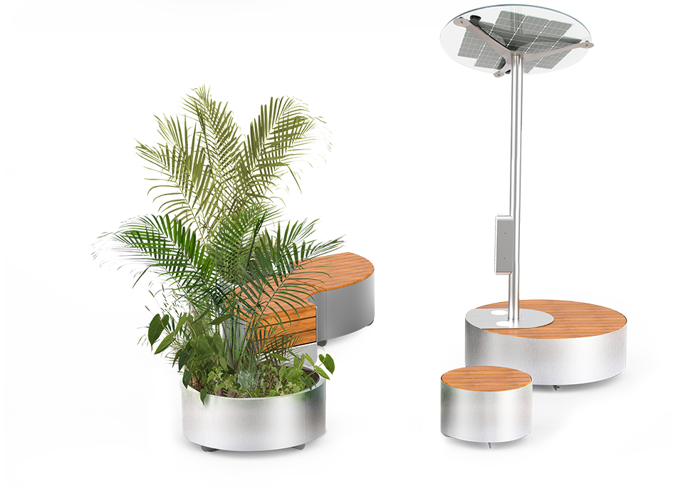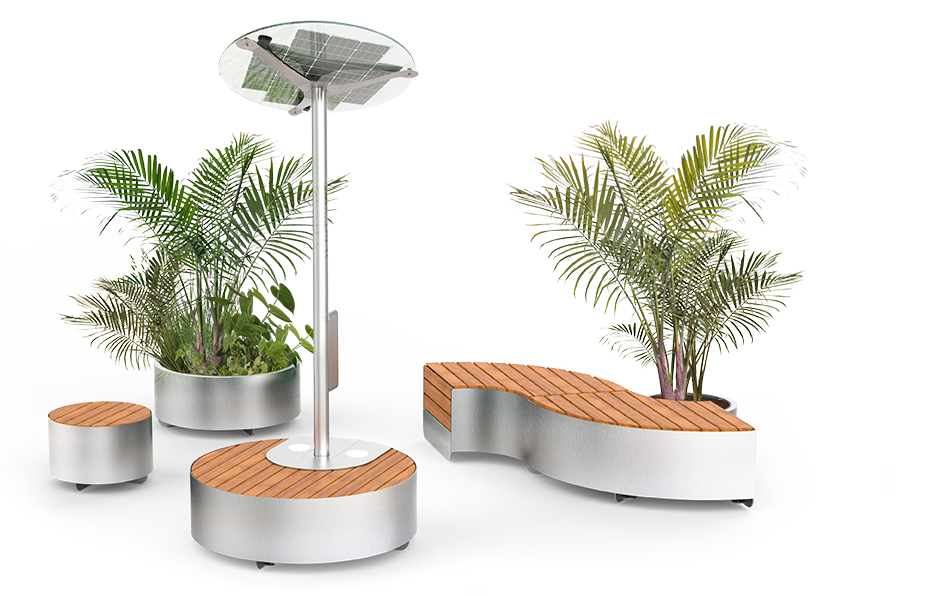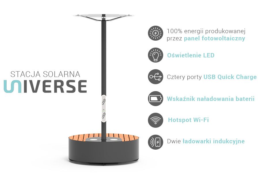 Solarna stanica Universe je još jedan proizvod u liniji Smart City . Kao i njezin prethodnikSuncokret napaja se solarnom energijom koja se obrađuje fotonaponskim panelima. Ovaj proizvod može se koristiti kao klupa koja, osim svoje tipične namjene, omogućuje punjenje mobitela i tableta – i putem induktivnih punjača i putem USB-A priključaka za brzo punjenje. Također može biti opremljen Wi-Fi modulom, što vam omogućuje korištenje brzog interneta u urbanim prostorima. Konstrukcija je izrađena od pocinčanog i praškasto obojenog ugljičnog čelika ili opcionalno od nehrđajućeg čelika. Drveni elementi izrađeni su od lakiranog europskog mekog drva ili opcionalno nauljenog egzotičnog drva. Iznad sjedala postavljen je vlastiti fotonaponski panel od sigurnosnog stakla. Sastavljanje stanice s drugim proizvodimaredak Universe Možete stvoriti jedinstvenu kompoziciju malih arhitektonskih objekata u javnim prostorima.
