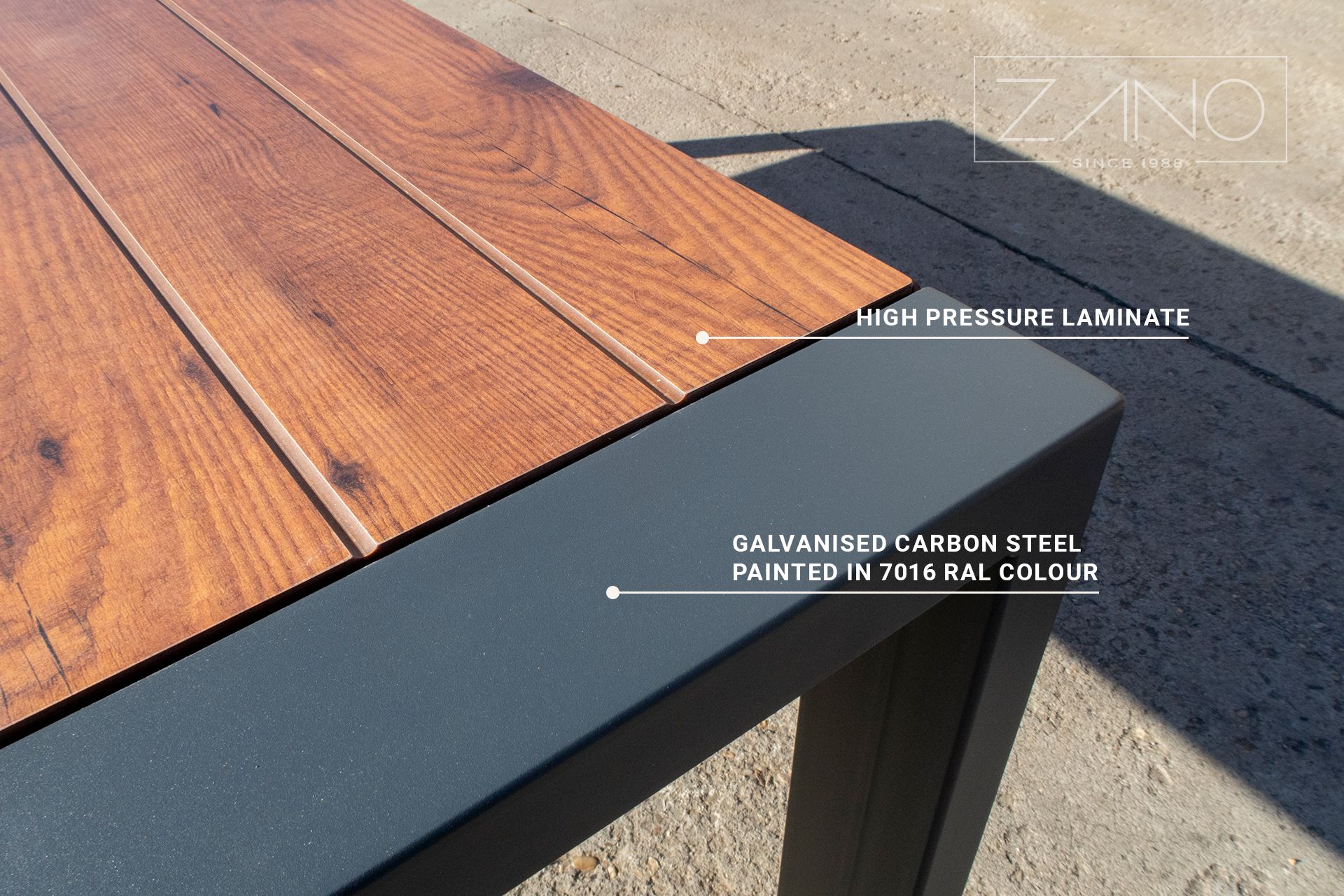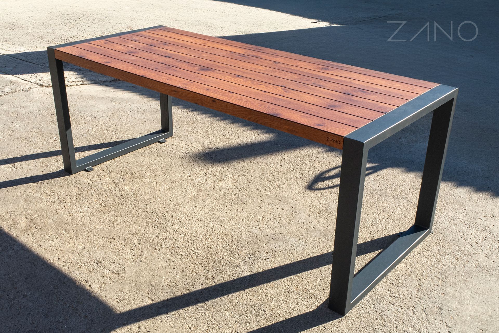 Moderni stol iz linije Modern, stilski podsjeća na klupe iz linije Pluris. Konstrukcija stola temelji se na čeličnim profilima oštrih, agresivnih oblika. Ploča stola izrađena je od drvenih dasaka, dostupnih u domaćem i egzotičnom drvu.
