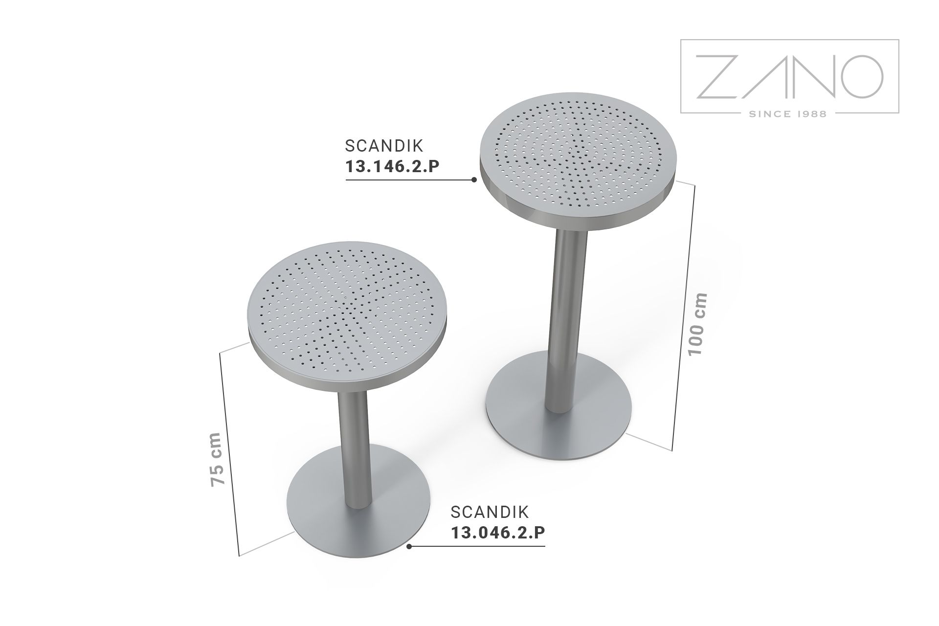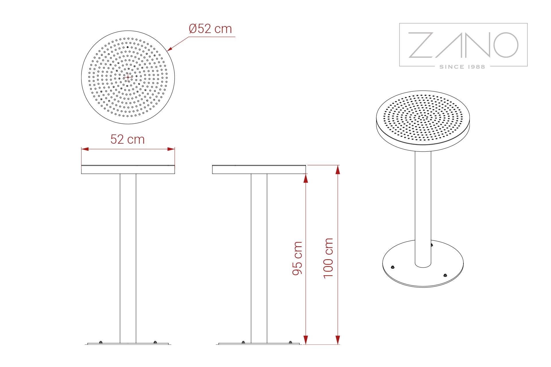 Visoki, okrugli čelični stol. Ploča stola izrađena je od perforiranog čelika. Okvir je izrađen od nehrđajućeg čelika ili, na zahtjev, od ugljičnog čelika, pocinčan i plastificiran u određenoj RAL boji. Ovaj stol je savršen za barove, restorane i kafiće. Nehrđajući čelik ili pocinčani ugljični čelik jamče trajnost i otpornost na vanjske vremenske uvjete.
