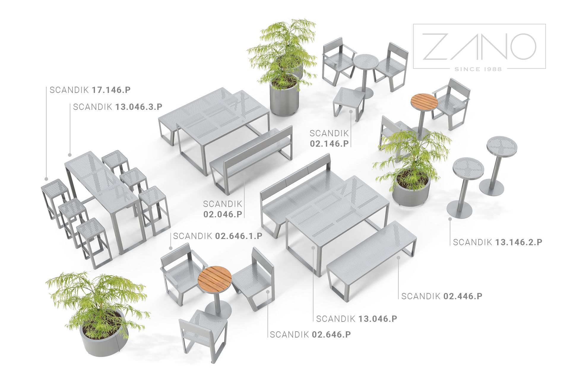 Scandik klupe i sjedala predstavljene u nastavku izrađene su od nehrđajućeg čelika. I sjedala i klupe dostupne su u tri varijante: bez naslona, s naslonom te s naslonom i naslonima za ruke.